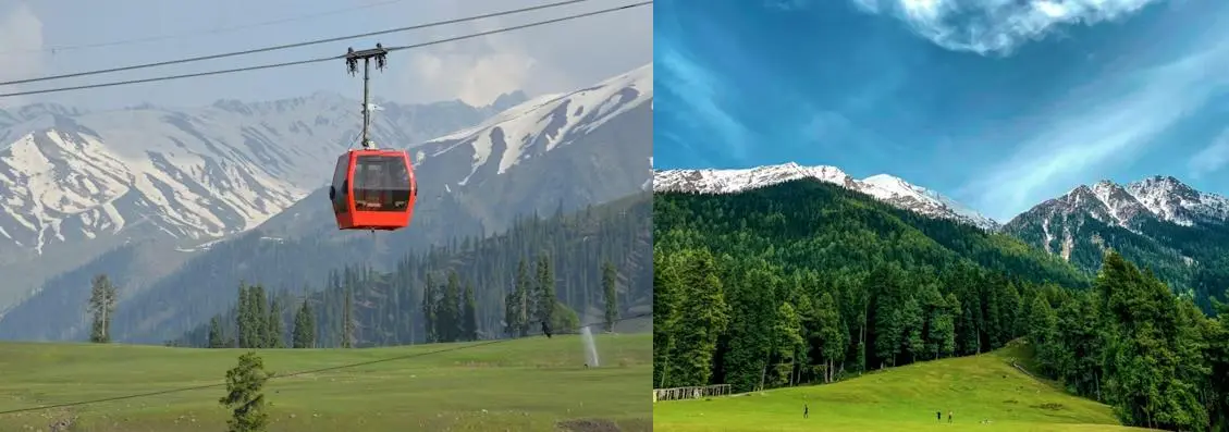 Gulmarg sits at an elevation of around 2,650 metres. Snow in winter transforms it into a ski destination. In summer, green meadows stretch beneath the Pir Panjal range. The famous Gulmarg Gondola carries visitors higher, offering expansive mountain views.