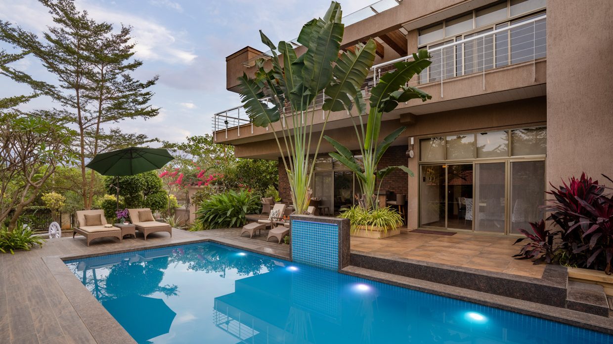 Unwind with family at The Ray, a 5-bedroom villa in Alibaug with floor-to-ceiling windows, sprawling rooms and a pool lounge for post-swim conversations and nibbles.